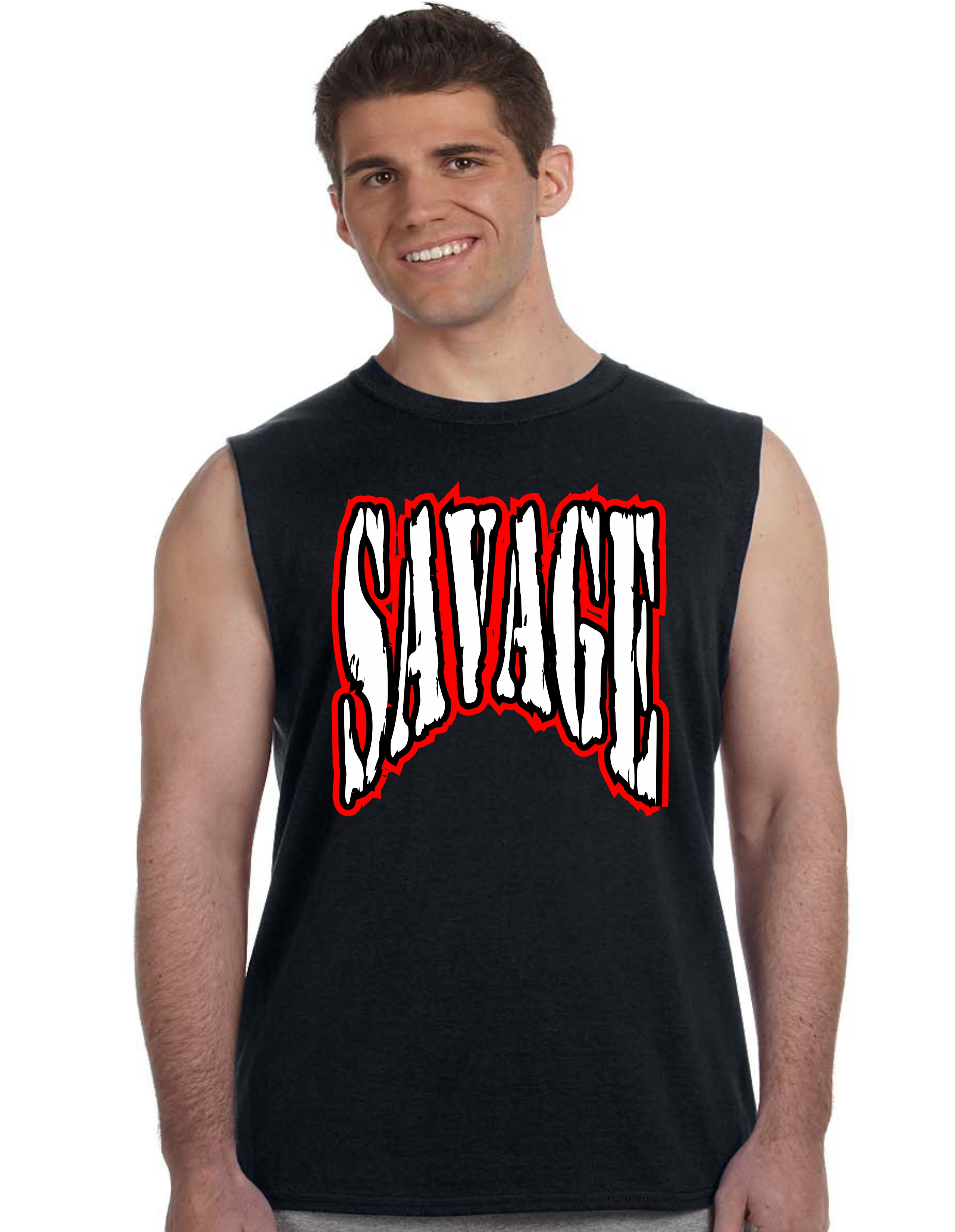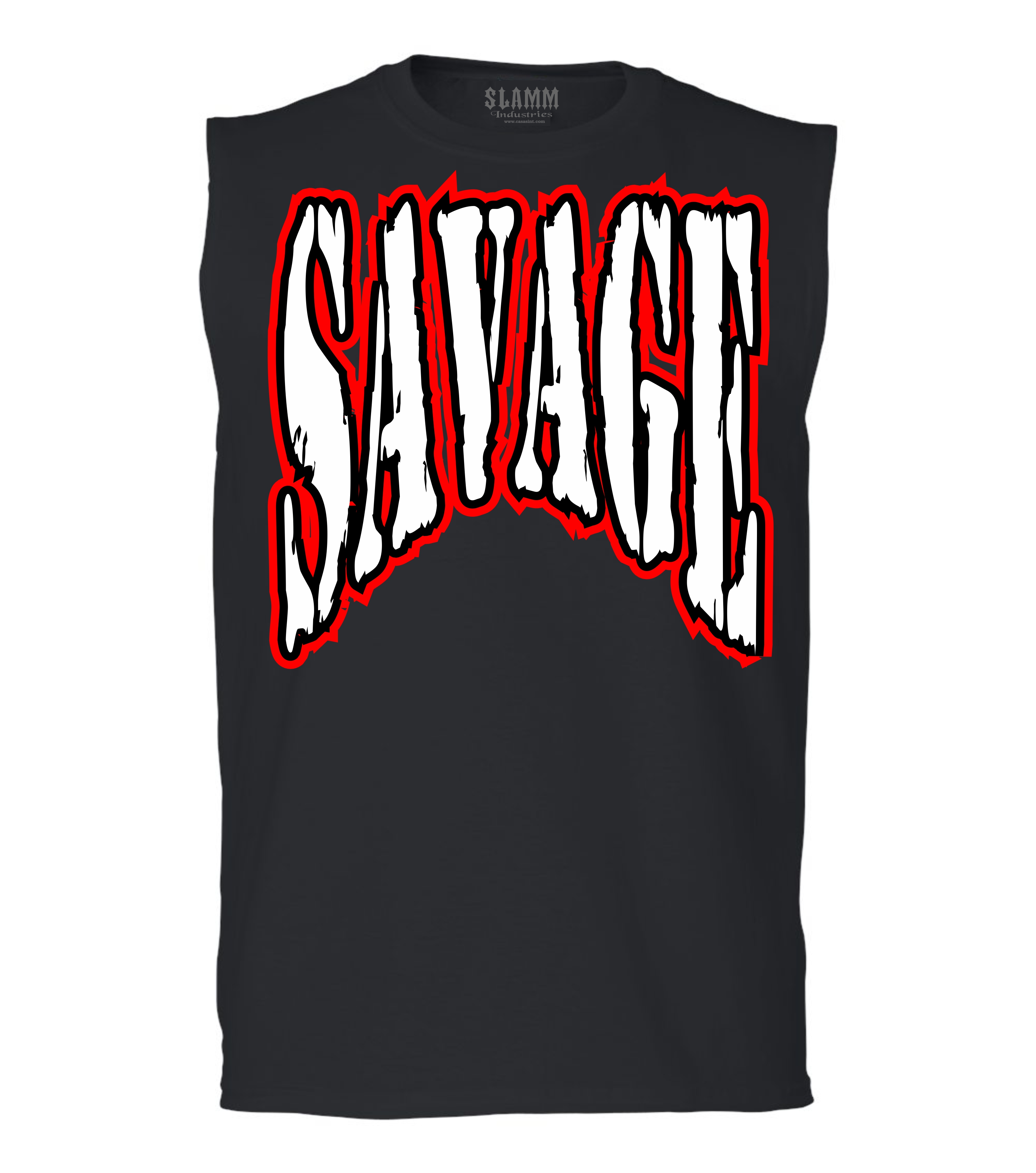 SAVAGE Sleeveless Tee by SLAMM INDUSTRIES a CASAS Brand, Front & Back prints, Multi-color prints. 6.1 oz., pre-shrunk 100% Ultra cotton Double-needle stitched neckline and sleeves, Seamless collar, hemmed armholes, Quarter-turned, Custom hand screen printed