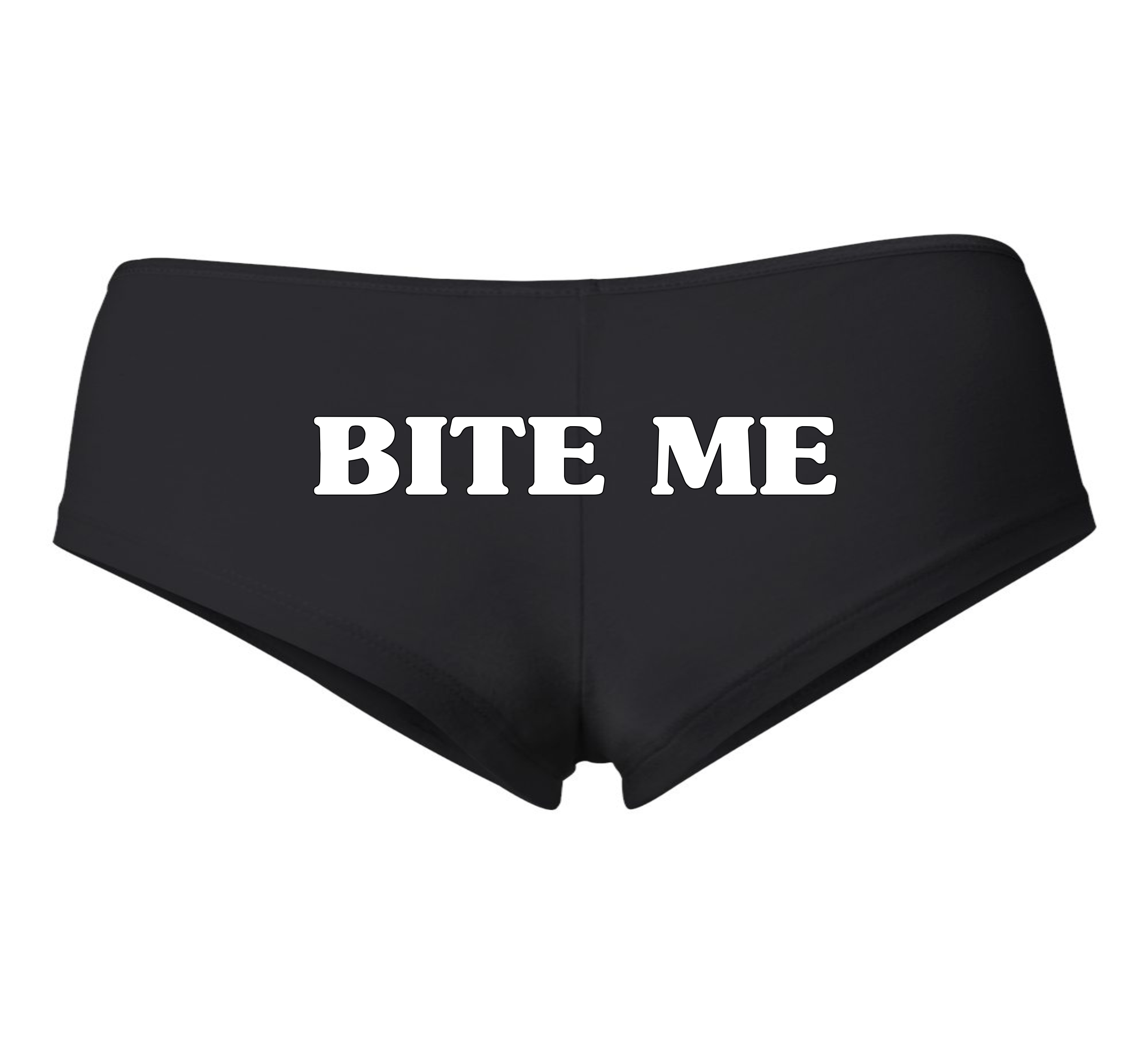 BITE ME Booty Shorts, printed in white Ink , 5.9 oz., 95/5 combed ring spun cotton/spandex , Quarter inch elastic satin trim.