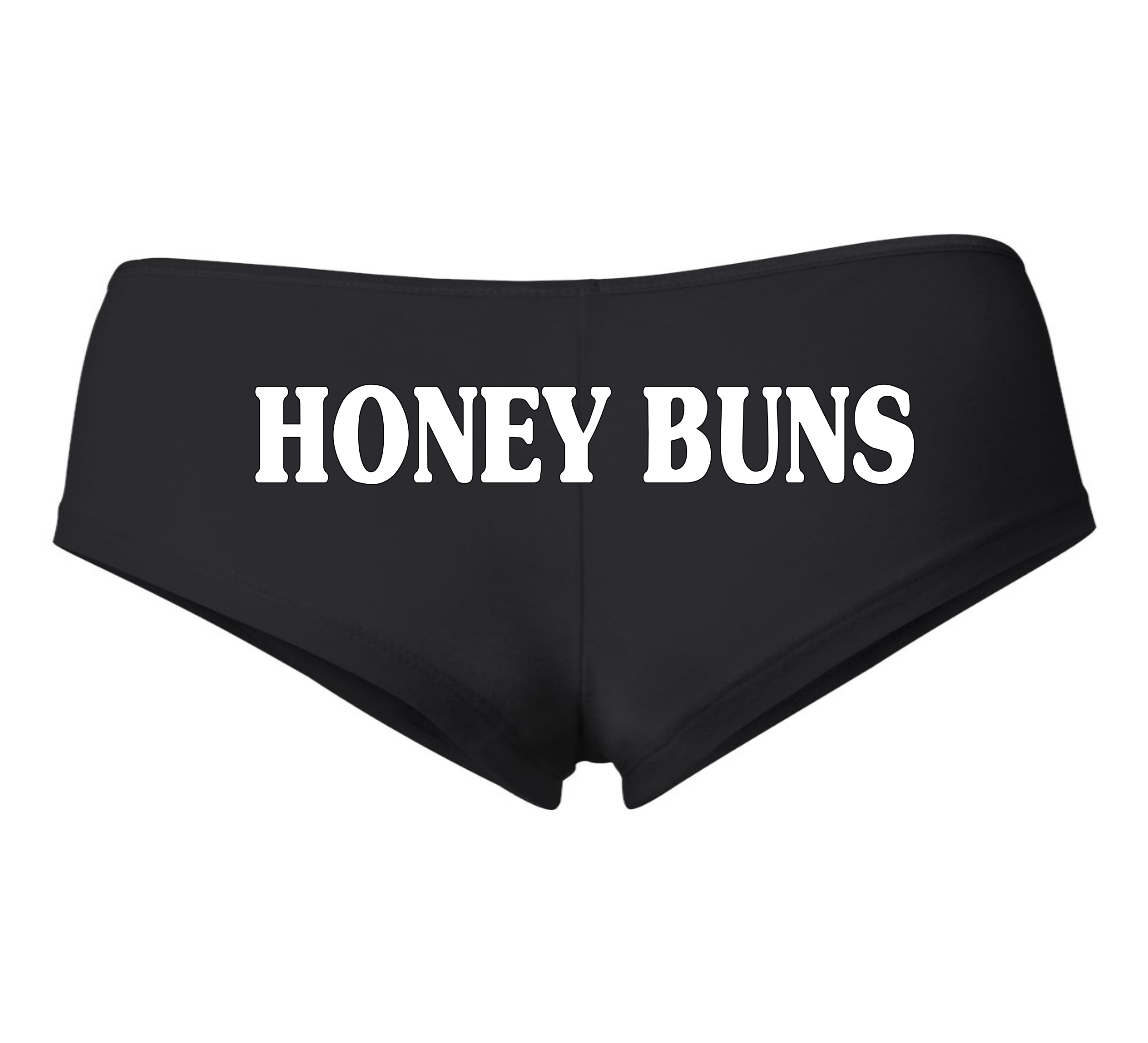 HONEY BUNS Booty Shorts By 5150 A CASAS Int. Brand. Printed in White ink on Black shorts, 5.9 oz., 95/5 combed ring spun cotton/spandex , Quarter inch elastic satin trim