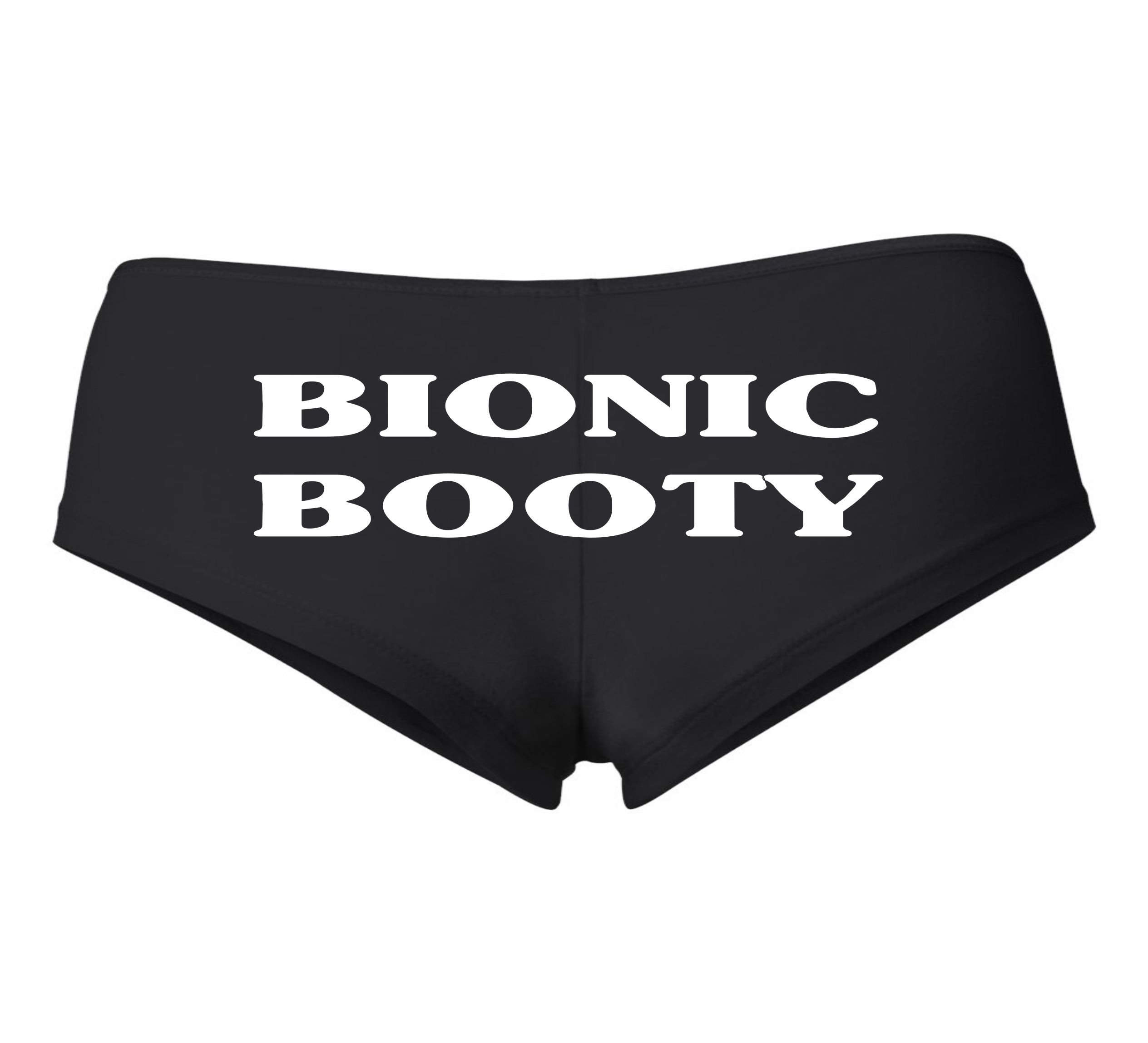 BIONIC Booty Shorts, By 5150 a CASAS Int. Brand, Printed in white Ink , 5.9 oz., 95/5 combed ring spun cotton/spandex , Quarter inch elastic satin trim.