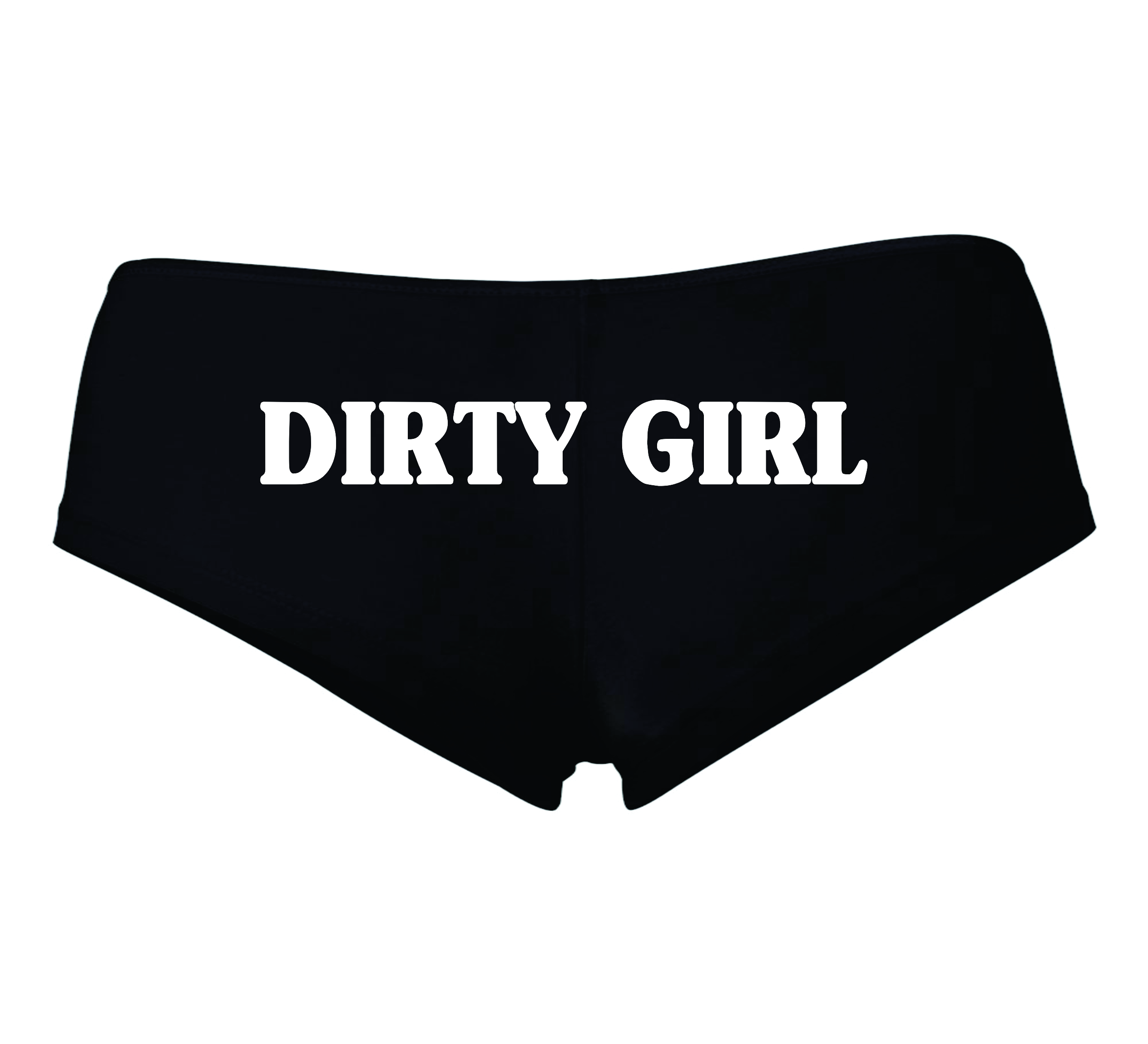 DIRTY GIRL Booty Shorts by 5150 a CASAS Int. Brand, printed in white Ink , 5.9 oz., 95/5 combed ring spun cotton/spandex , Quarter inch elastic satin trim.