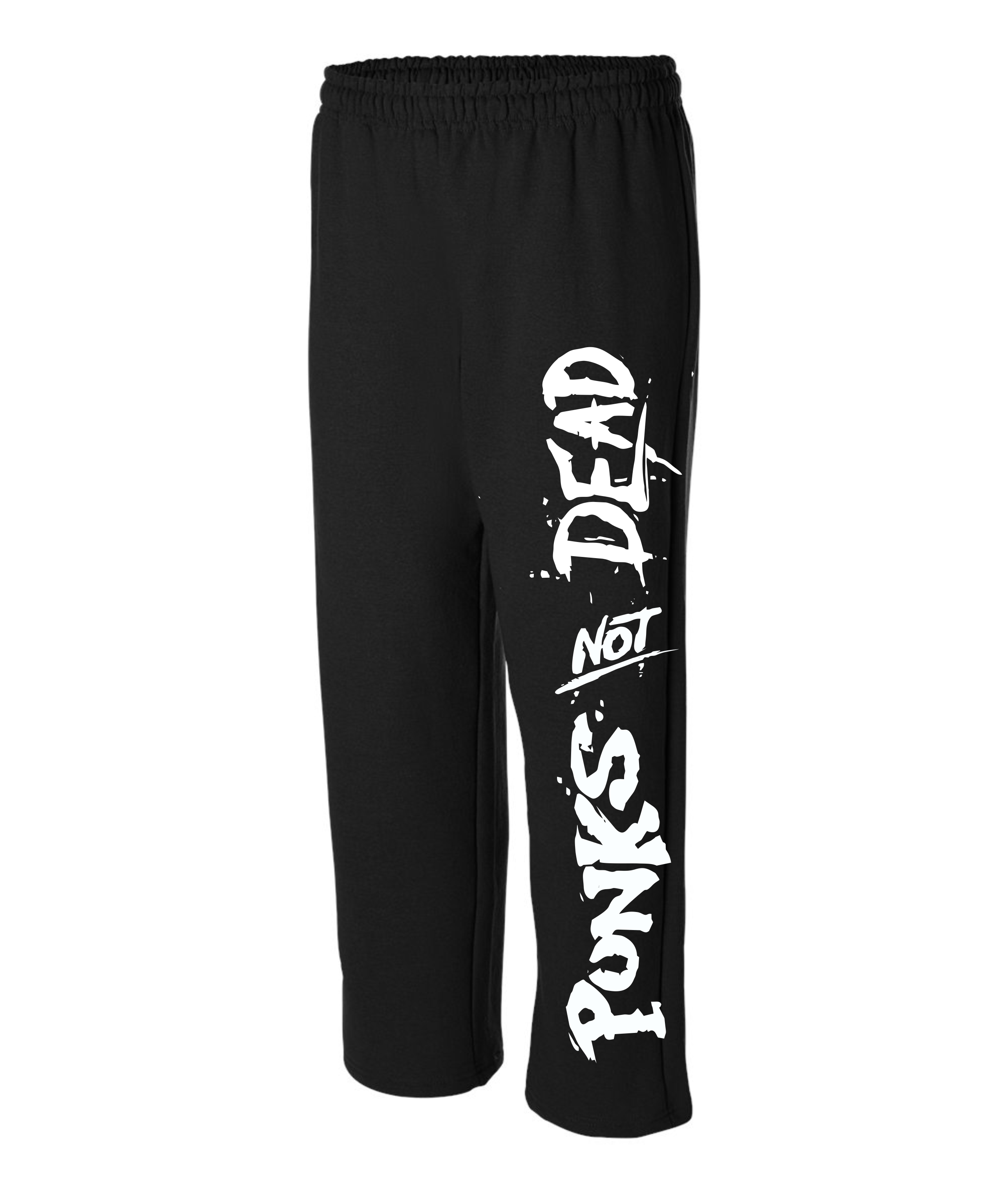 PUNKS NOT DEAD Sweatpants By 5150 Clothing Co., Printed in white ink, 8.0 oz., 50/50 cotton/polyester, Reduced pilling and softer air-jet spun yarn, Covered elastic waistband with draw cord , open bottom leg cuffs, Custom Screen Printed.