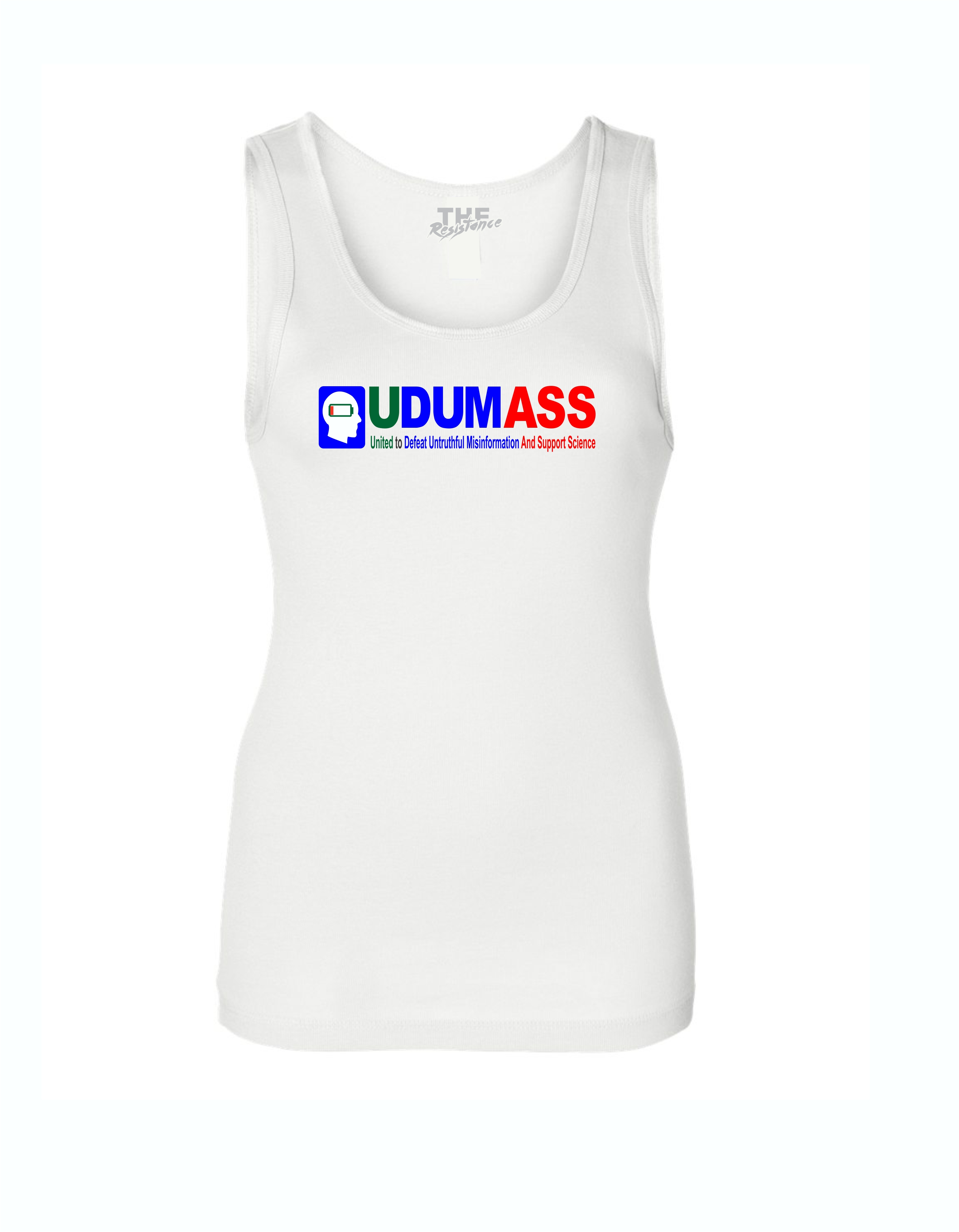 UDUMASS Ladies Tank by THE RESISTANCE Clothing Co. a CASAS Brand , Ladies Baby Rib Tank Top , 5.8 oz., 100% combed ring spun cotton, Side seamed for a fashionable custom contoured fit. Three-eighths inch self binding on armholes and neckline. Custom hand screen printed.
