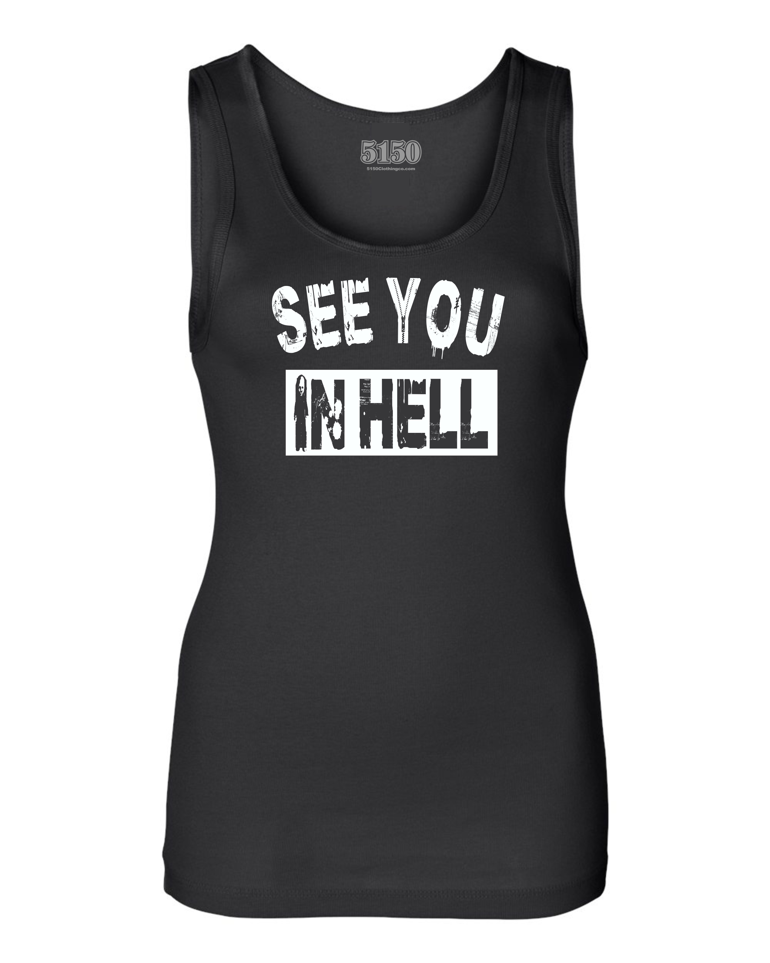 SEE YOU IN HELL Ladies tank by THE ZOO Urban Outfitters a CASAS Brand. Ladies Baby Rib Tank Top, 5.8oz., 100% Combed ring spun cotton, Side seamed for a fashionable custom contoured fit. Three eights inch self binding on arm holes and neckline, custom hand screen printed in specially blended inks , Soft hand additive for a soft comfortable feel and Stretch additive to prevent cracking.