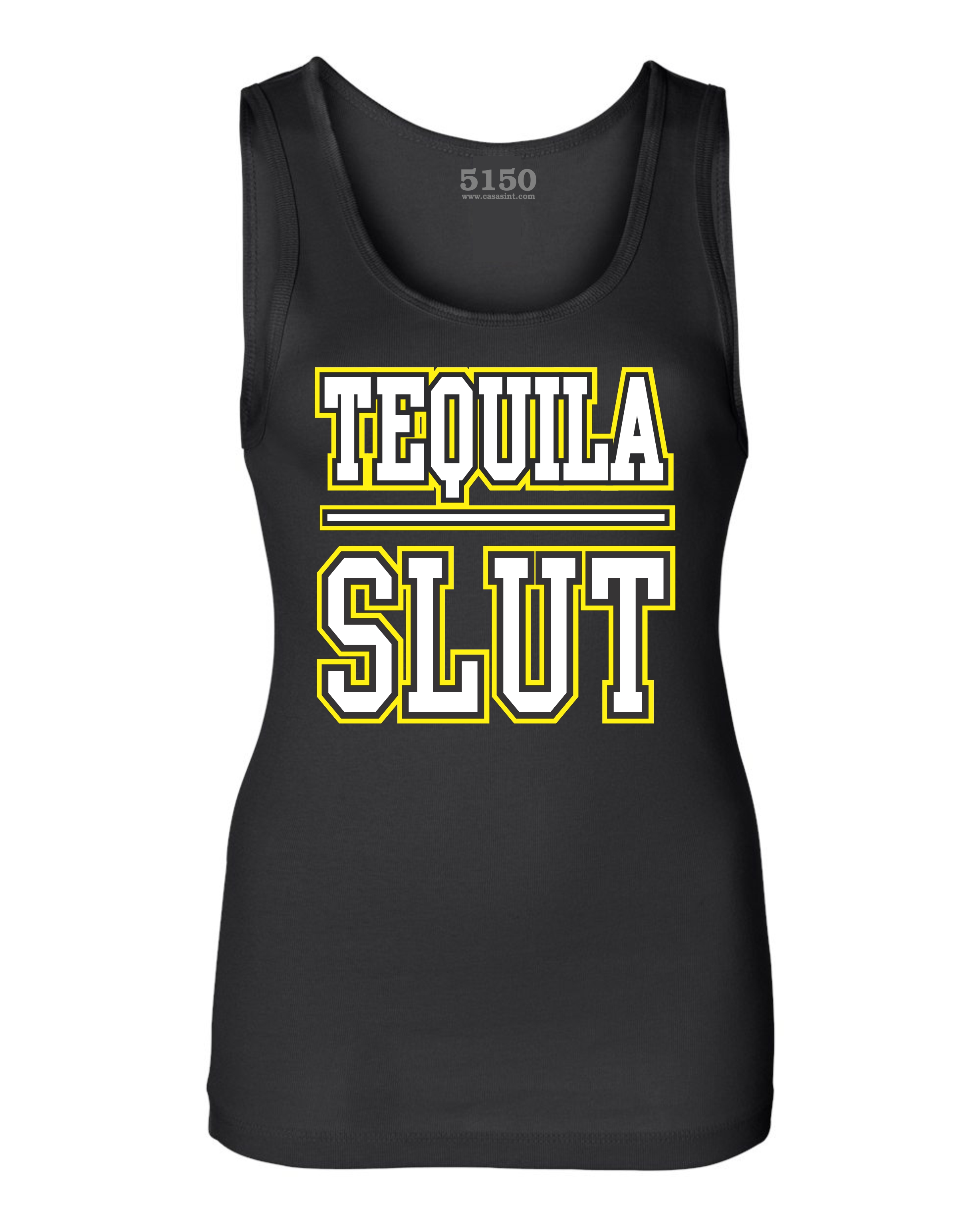 TEQUILA SLUT Ladies Tank by 5150 a CASAS Int. Brand , Ladies Baby Rib Tank Top , 5.8 oz., 100% combed ring spun cotton, Side seamed for a fashionable custom contoured fit. Three-eighths inch self binding on armholes and neckline. Custom hand screen printed.