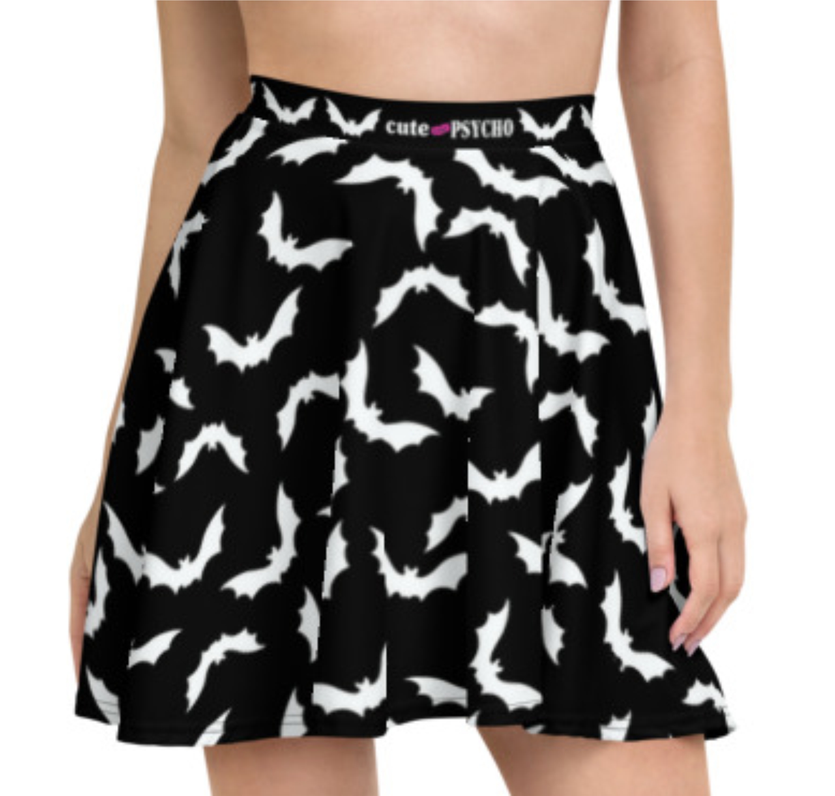 BATTS Skater Skirt # 6009BLK by CUTE BUT PSYCHO. A CASAS Brand, 82% polyester, 18% spandex, Smooth fabric, Mid-thigh length, Elastic waistband, Over lock seams, cover stitch hemline, All our skirts are Printed, cut, and hand-sewn by our expert in-house teams